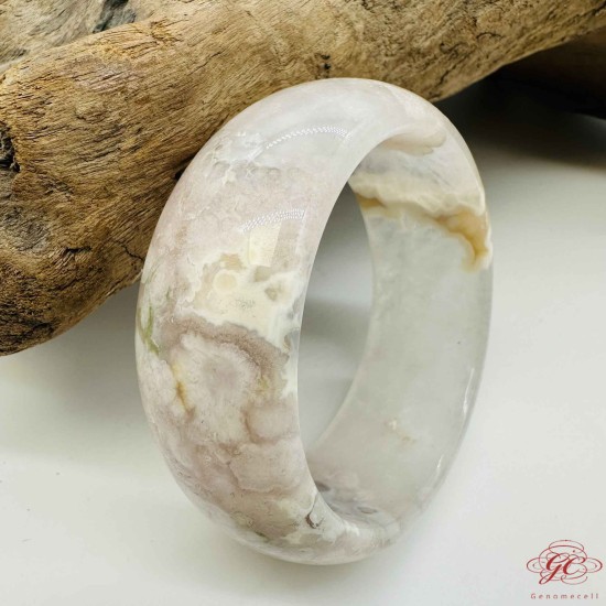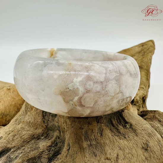 櫻花瑪瑙,又稱為櫻花玉髓(Cherry Blossom Agate),是一種來自非洲馬達加斯加的珍稀寶石。它因內含獨特的白色或粉色礦物花紋,宛如朵朵櫻花綻放在透亮的瑪瑙之中,因此得名「櫻花瑪瑙」。每一只手鐲都是大自然的藝術品,獨一無二,專屬於你的美麗與優雅。