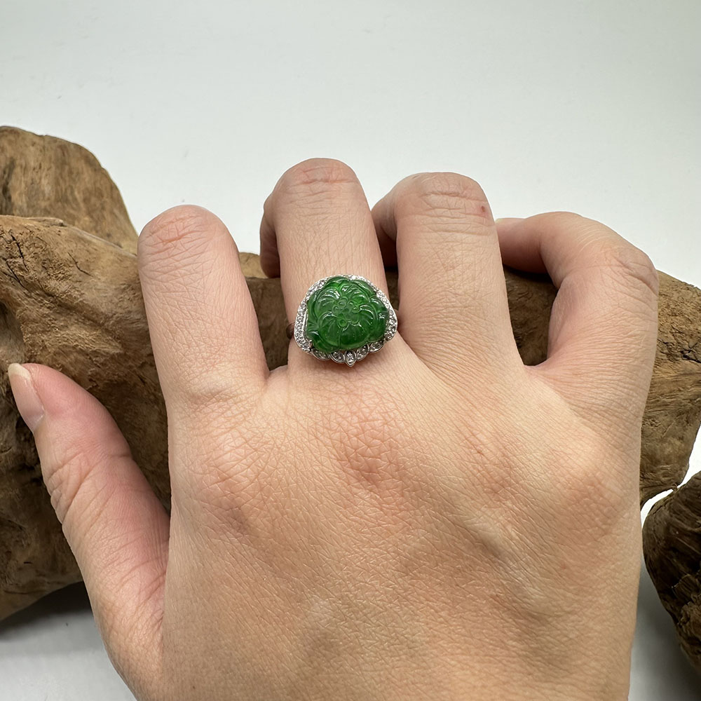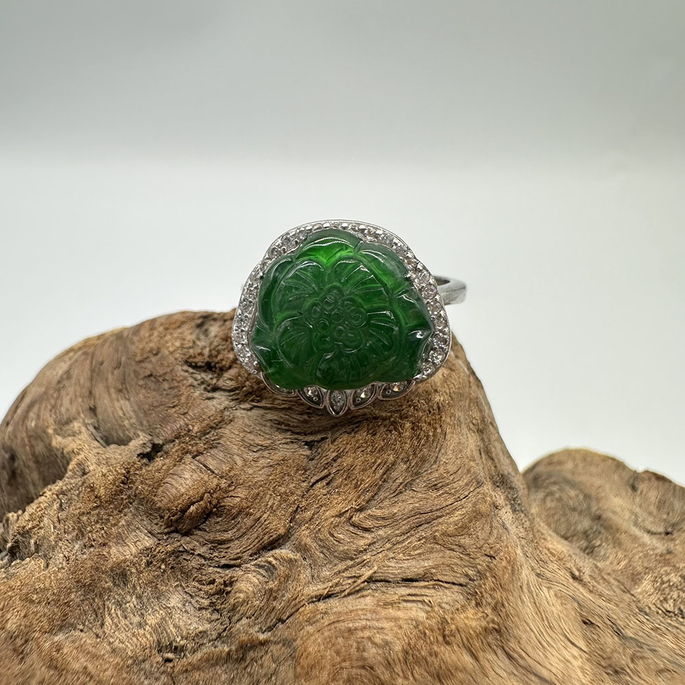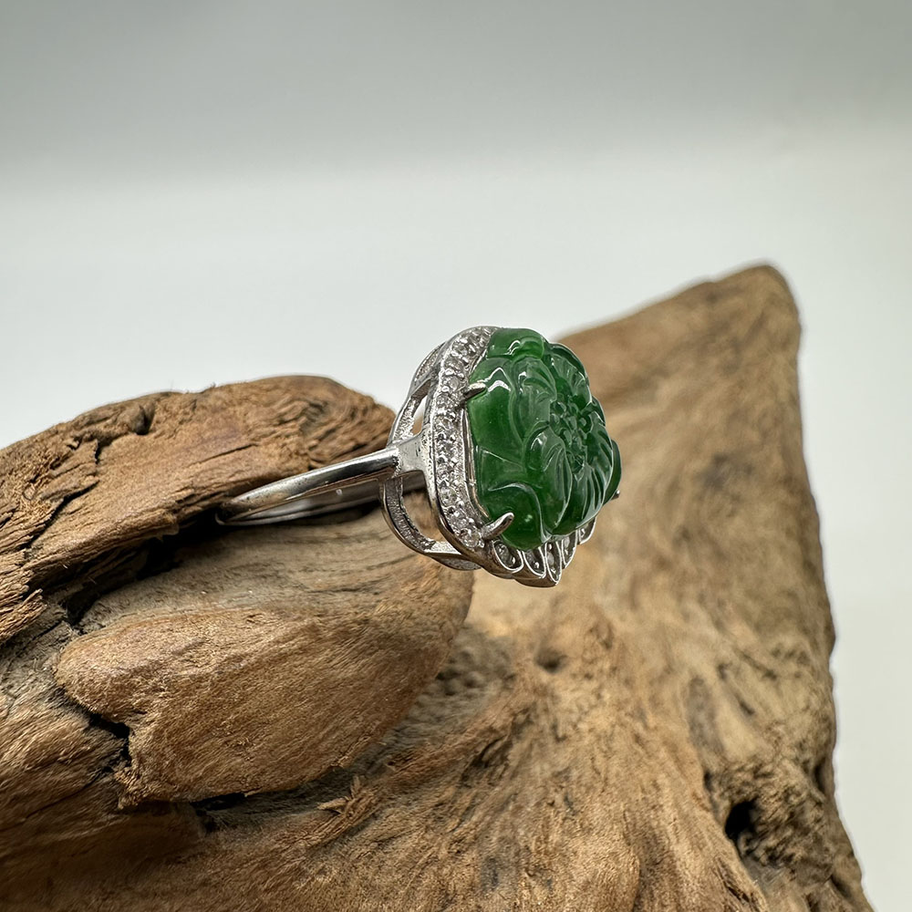 【肌容雪】天然緬甸A貨翡翠雕刻牡丹花可調節戒指 編號242(戒圍18.6mm#15號)