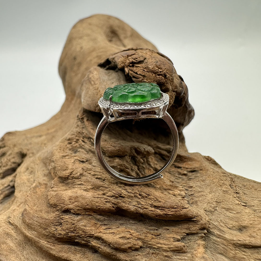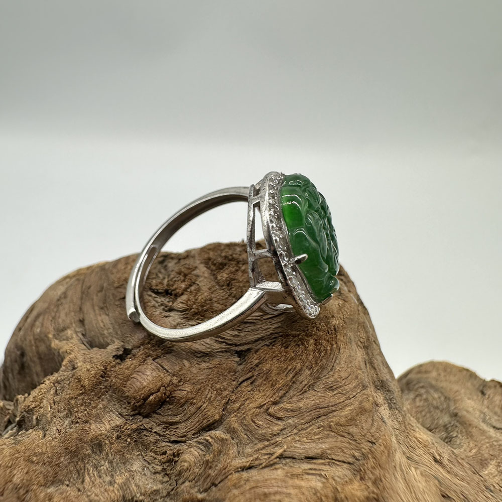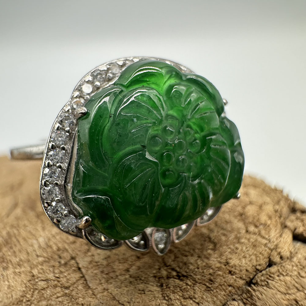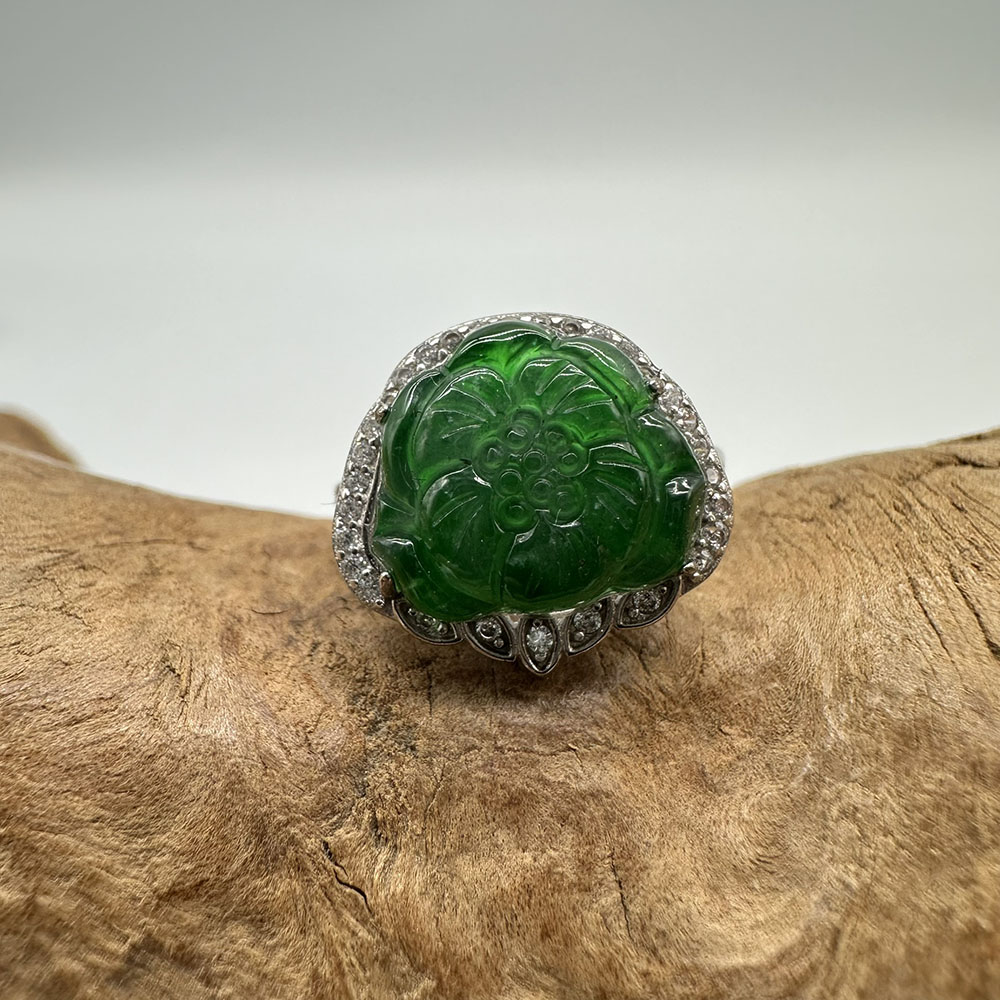 【肌容雪】天然緬甸A貨翡翠雕刻牡丹花可調節戒指 編號242(戒圍18.6mm#15號)