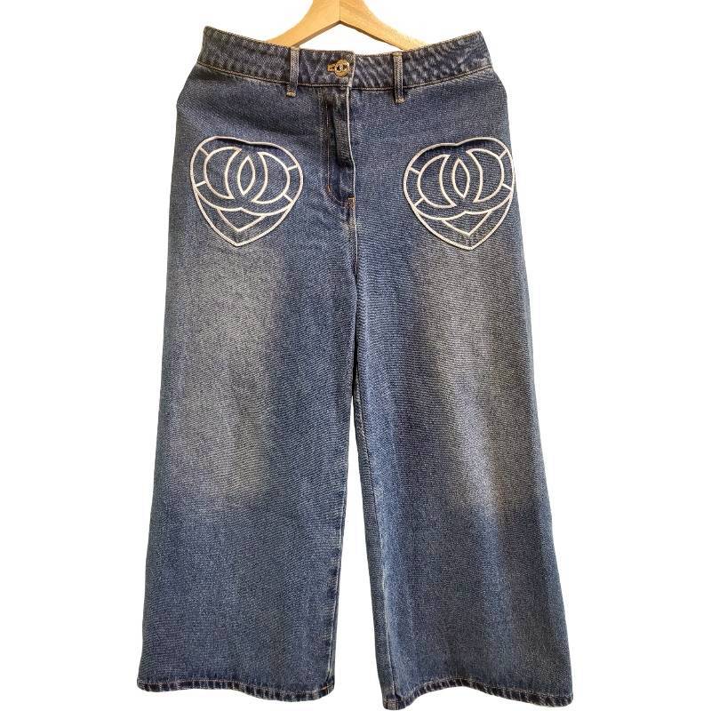 二手奢侈品香奈兒Chanel淺藍色寬版牛仔褲 (9.9新, 腰38臀50長90)-編號S100