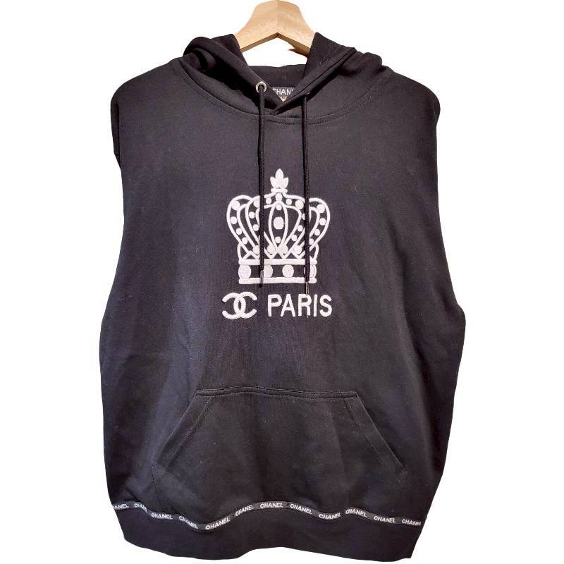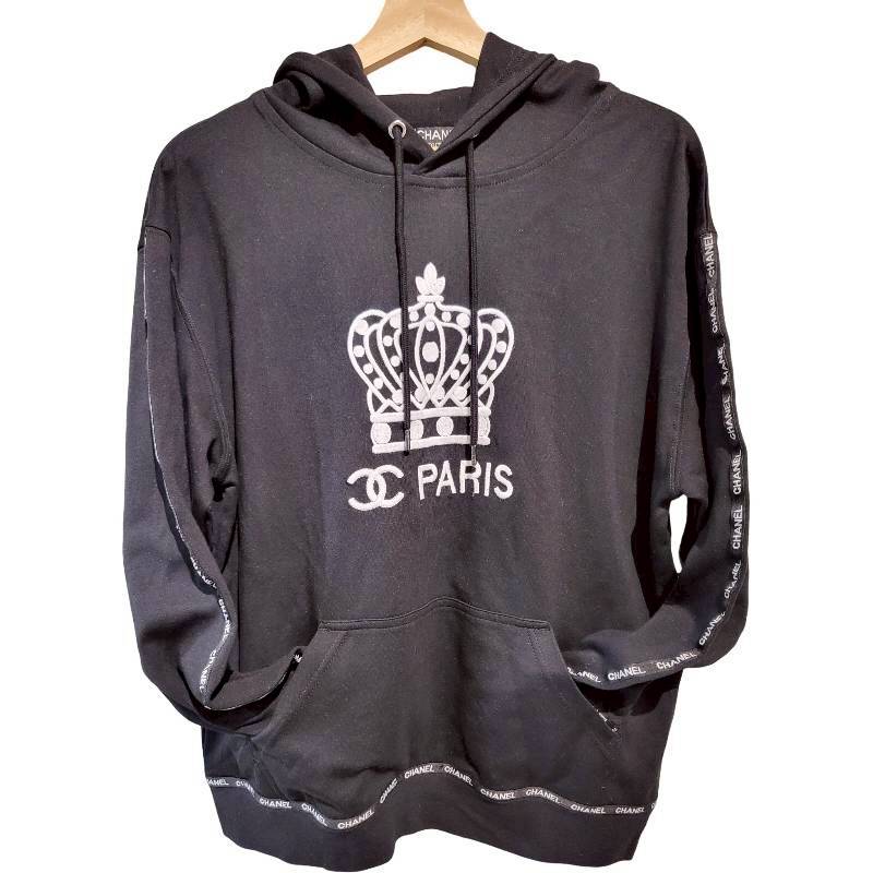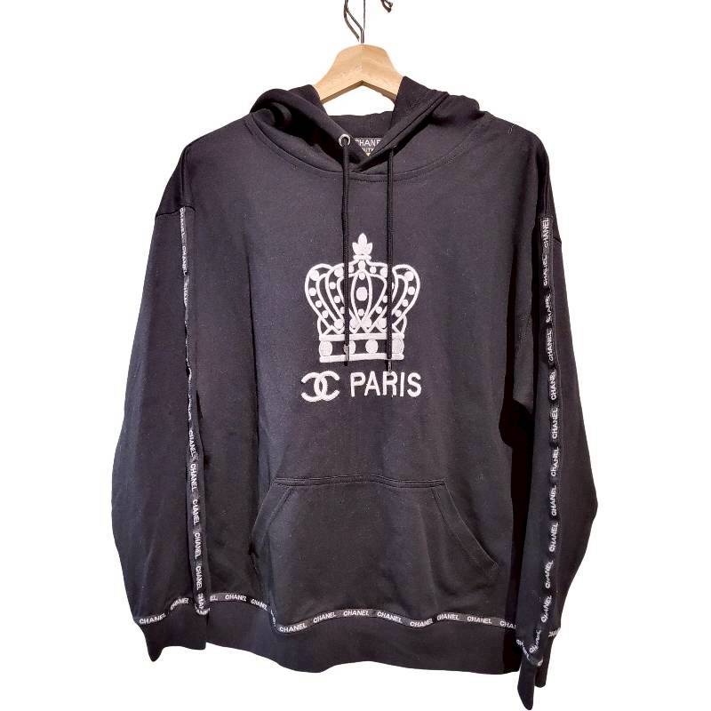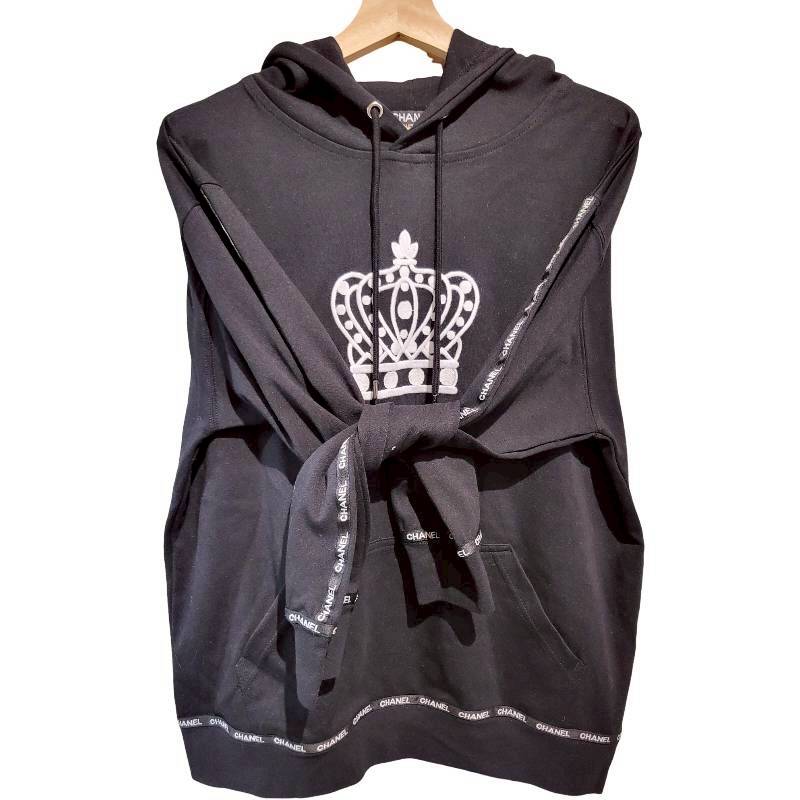 二手奢侈品香奈兒Chanel經典 CC 標誌皇冠圖案黑色連帽衫(9.9新, 肩60胸60長66)-編號S115