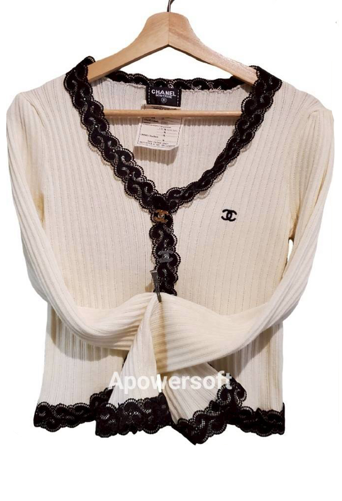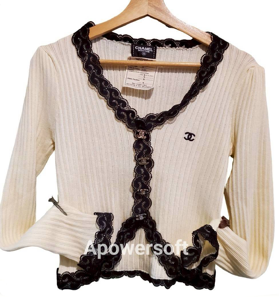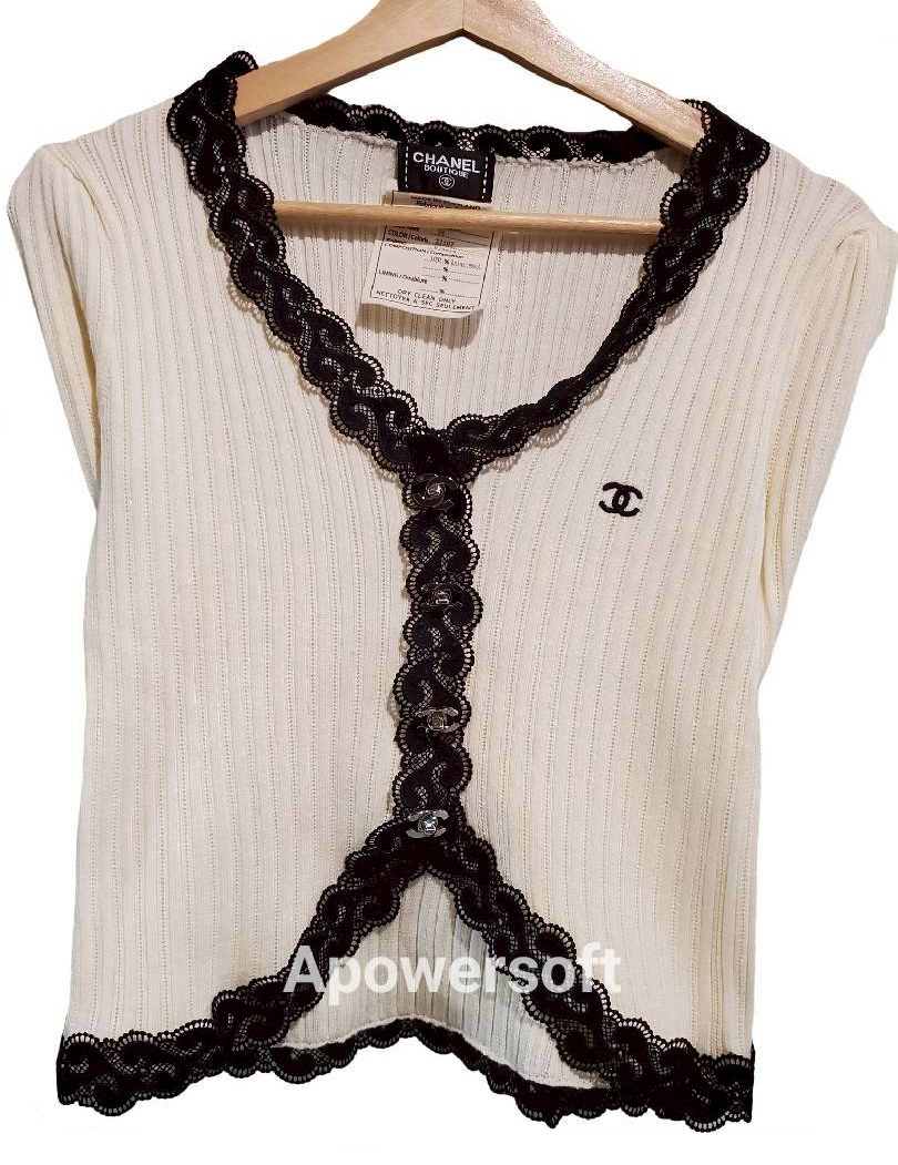 二手奢侈品Chanel香奈兒米白滚邊黑色蕾絲綿製短上衣(9.9新,肩40胸42長47)-編號S37