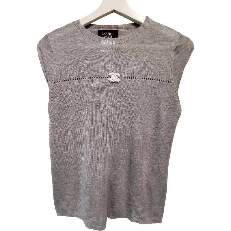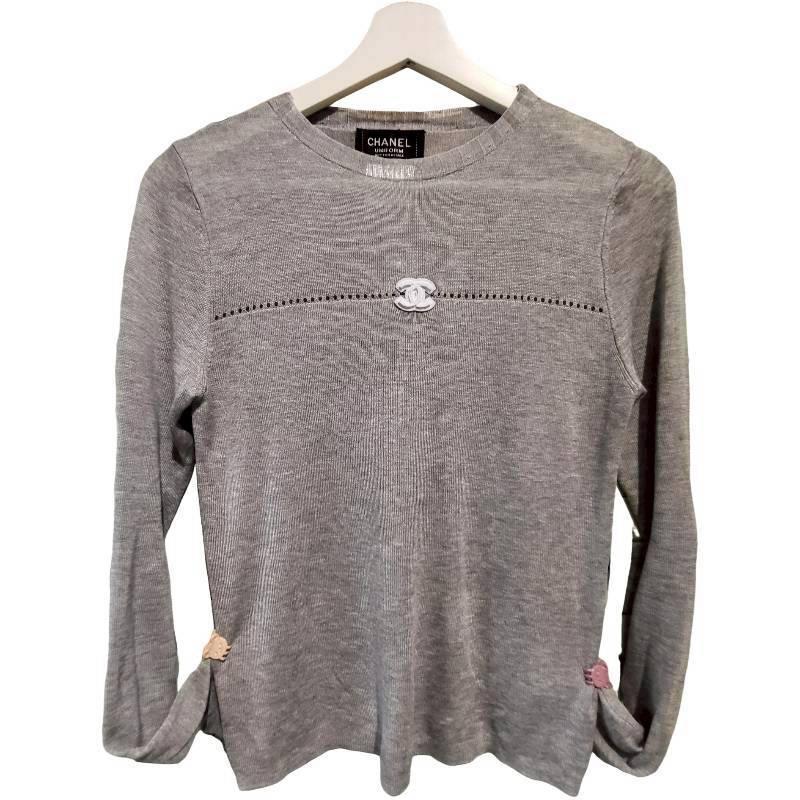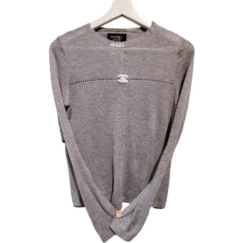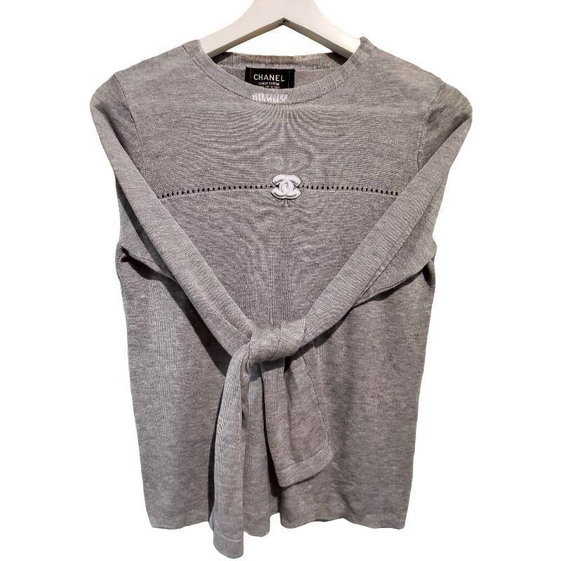 二手奢侈品Chanel香奈兒Uniform系列灰色長袖針織上衣(9.9新, 肩36×胸48×長58)-編號S155